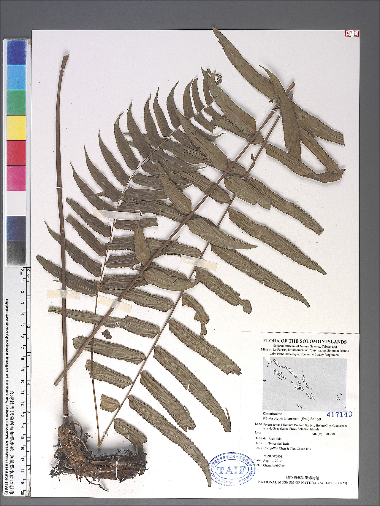 | Field Number: SITW00081 Catalog Number: SITW00081-TAIF-001 Family Name: Nephrolepidaceae, Pteridophyte Collector(s): Cheng-Wei CHEN & Tian-Chuan HSU Determinated by: C.W. Chen Collected Date: 15 August 2012 Locality: Forests around Honiara Botanic Garden, Hoiara City, Guadalcanal Island, Guadalcanal Province GPS Coordinates: (9° 25' 59.1" S, 159° 56' 29.4" E) Altitude (m): 30-70 Habit: Terrestrial, herb Habitat: Road side Herbarium: TAIF |