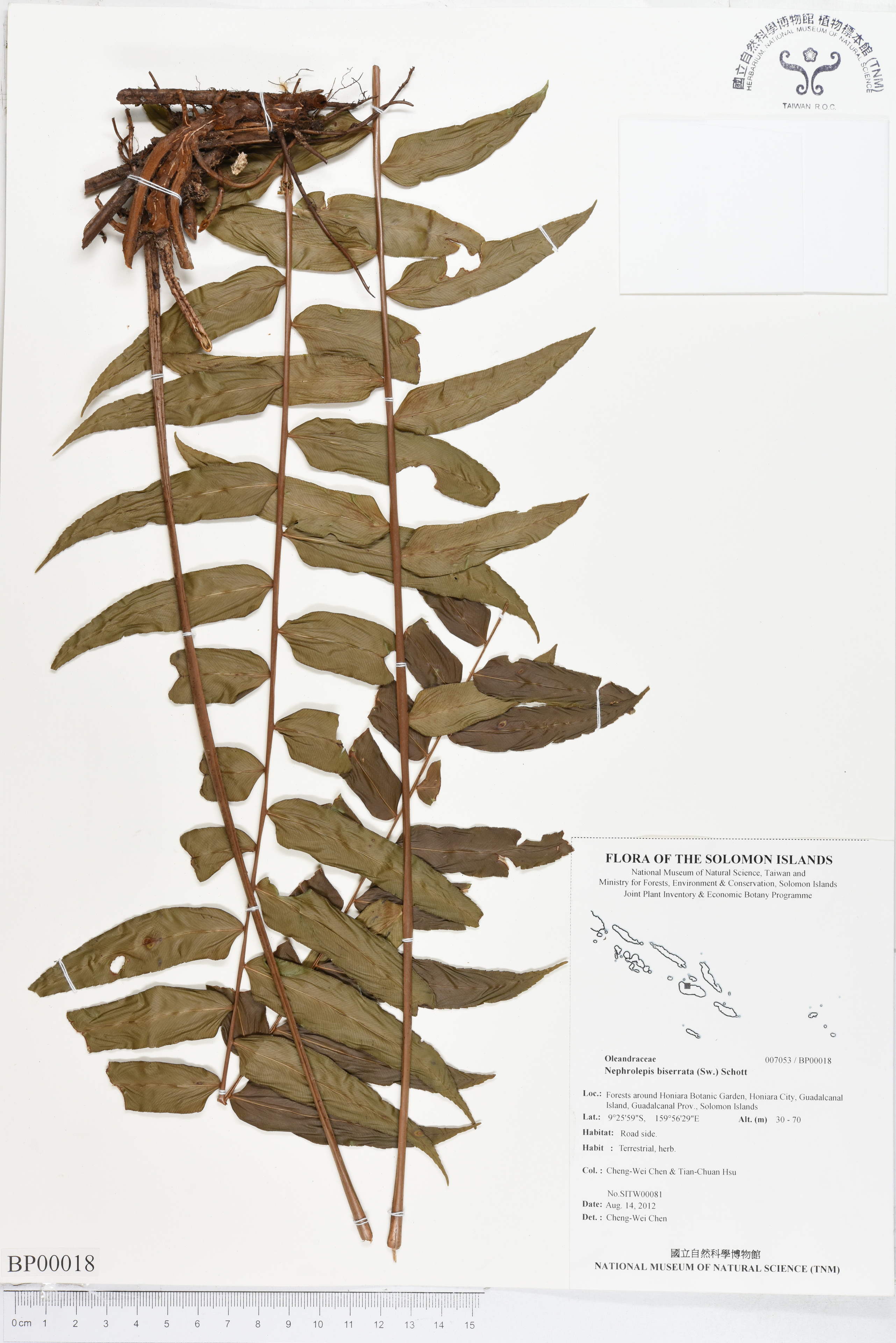 | Field Number: SITW00081 Catalog Number: SITW00081-TNM-001 Family Name: Nephrolepidaceae, Pteridophyte Collector(s): Cheng-Wei CHEN & Tian-Chuan HSU Determinated by: C.W. Chen Collected Date: 15 August 2012 Locality: Forests around Honiara Botanic Garden, Hoiara City, Guadalcanal Island, Guadalcanal Province GPS Coordinates: (9° 25' 59.1" S, 159° 56' 29.4" E) Altitude (m): 30-70 Habit: Terrestrial, herb Habitat: Road side Herbarium: TNM |