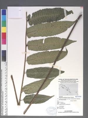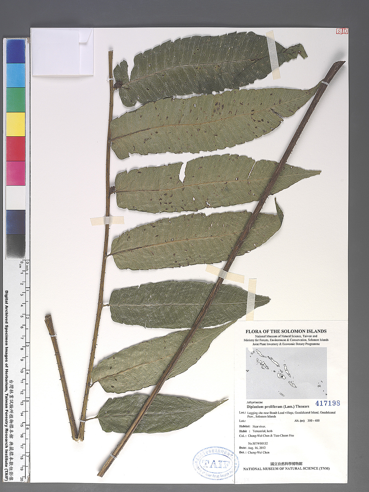 | Field Number: SITW00132 Catalog Number: SITW00132-TAIF-002 Family Name: Athyriaceae, Pteridophyte Collector(s): Cheng-Wei CHEN & Tian-Chuan HSU Determinated by: C.W. Chen Collected Date: 16 August 2012 Locality: Logging site near Bomb Load Village, Guadalcanal Island, Guadalcanal Province GPS Coordinates: (9° 25' 56.7" S, 159° 44' 28.7" E) Altitude (m): 300-400 Habit: Terrestrial, herb Habitat: Near river Herbarium: TAIF |
