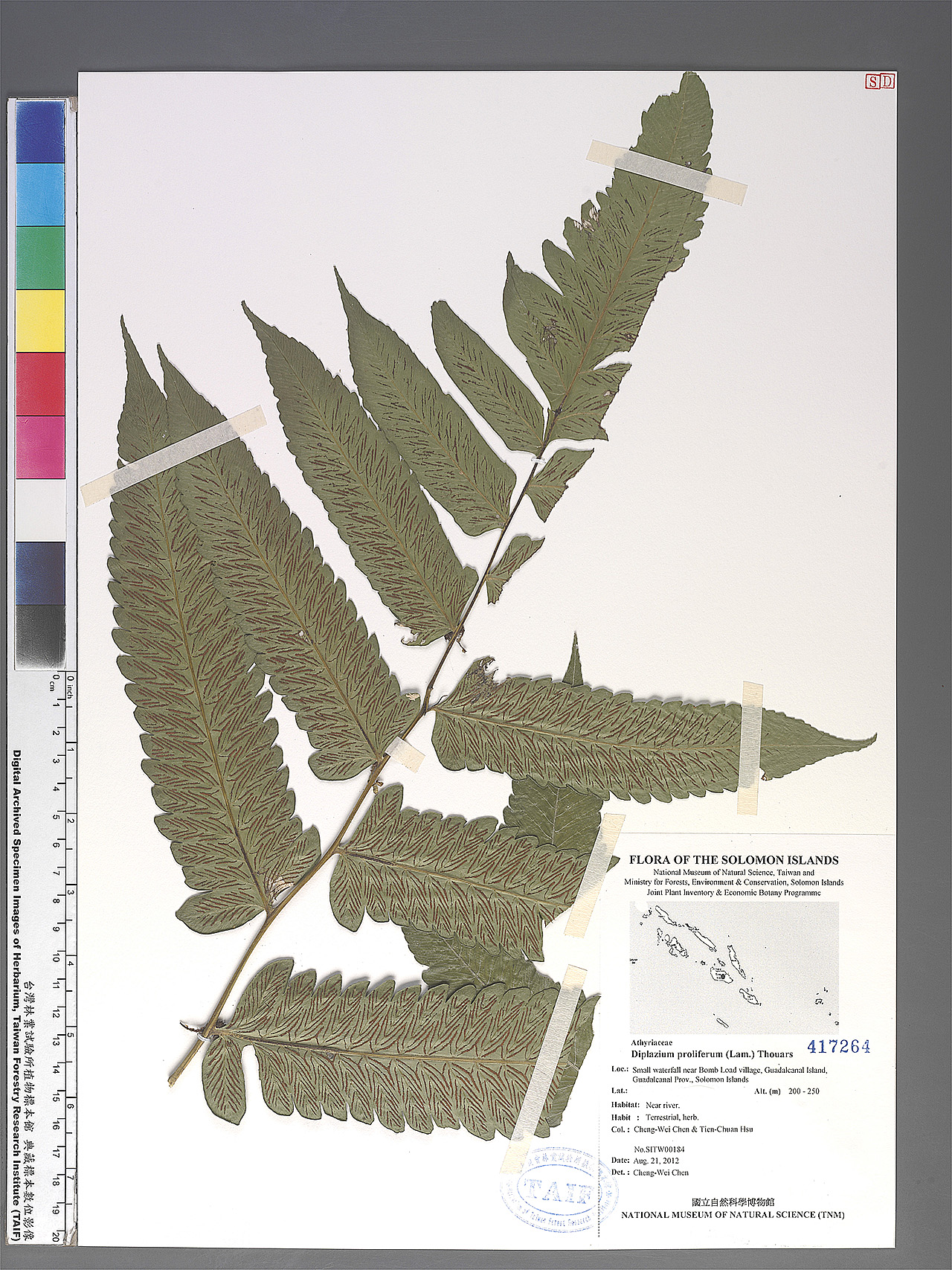 | Field Number: SITW00184 Catalog Number: SITW00184-TAIF-001 Family Name: Athyriaceae, Pteridophyte Collector(s): Cheng-Wei CHEN & Tian-Chuan HSU Determinated by: C.W. Chen Collected Date: 21 August 2012 Locality: Small waterfall near Bomb Load Village, Guadalcanal Island, Guadalcanal Province GPS Coordinates: (9° 25' 2.7" S, 159° 46' 42.5" E) Altitude (m): 200-250 Habit: Terrestrial, herb Habitat: Near river Herbarium: TAIF |