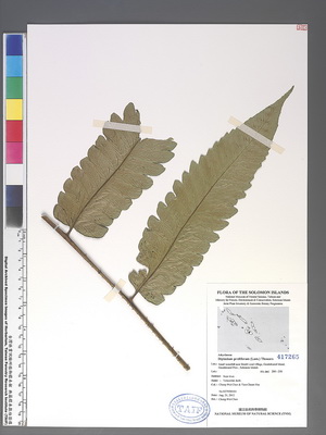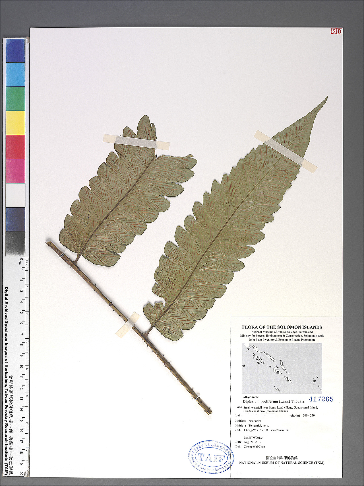 | Field Number: SITW00184 Catalog Number: SITW00184-TAIF-002 Family Name: Athyriaceae, Pteridophyte Collector(s): Cheng-Wei CHEN & Tian-Chuan HSU Determinated by: C.W. Chen Collected Date: 21 August 2012 Locality: Small waterfall near Bomb Load Village, Guadalcanal Island, Guadalcanal Province GPS Coordinates: (9° 25' 2.7" S, 159° 46' 42.5" E) Altitude (m): 200-250 Habit: Terrestrial, herb Habitat: Near river Herbarium: TAIF |