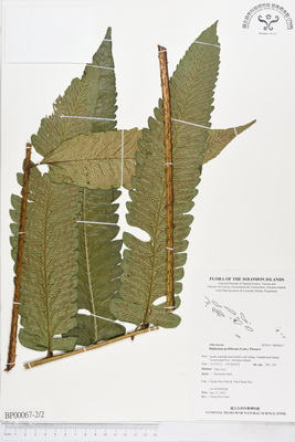 | Field Number: SITW00184 Catalog Number: SITW00184-TNM-002 Family Name: Athyriaceae, Pteridophyte Collector(s): Cheng-Wei CHEN & Tian-Chuan HSU Determinated by: C.W. Chen Collected Date: 21 August 2012 Locality: Small waterfall near Bomb Load Village, Guadalcanal Island, Guadalcanal Province GPS Coordinates: (9° 25' 2.7" S, 159° 46' 42.5" E) Altitude (m): 200-250 Habit: Terrestrial, herb Habitat: Near river Herbarium: TNM |