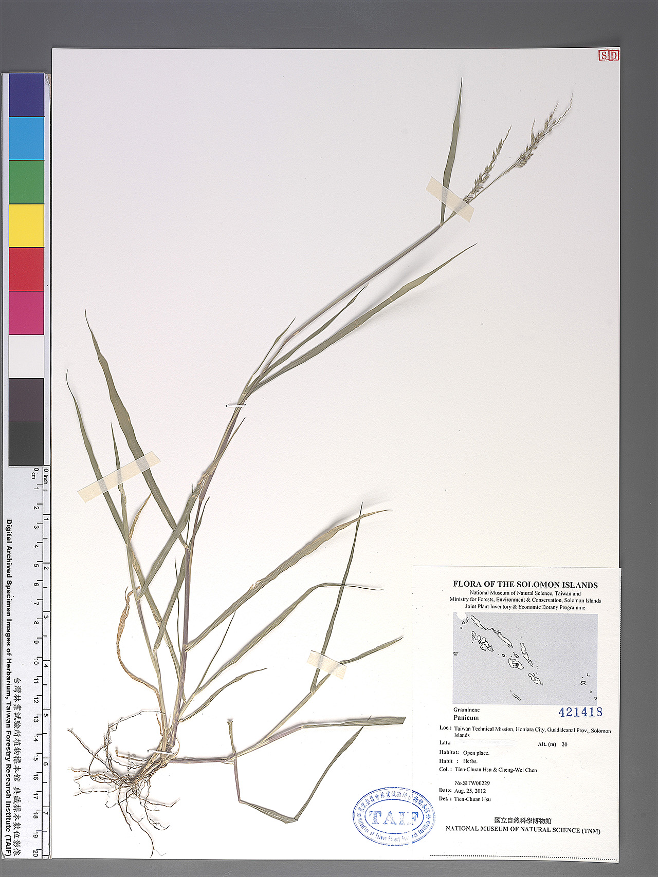 | Field Number: SITW00229 Catalog Number: SITW00229-TAIF-001 Family Name: Gramineae, Monocotyledon Collector(s): Tian-Chuan HSU & Cheng-Wei CHEN Determinated by: T.C. Hsu Collected Date: 25 August 2012 Locality: Taiwan Technical Mission, Honiara City, Guadalcanal Island, Guadalcanal Province. GPS Coordinates: (9° 25' 30.5" S, 160° 1' 7.8" E) Altitude (m): 20 Habit: Herbs. Habitat: Open place Herbarium: TAIF |