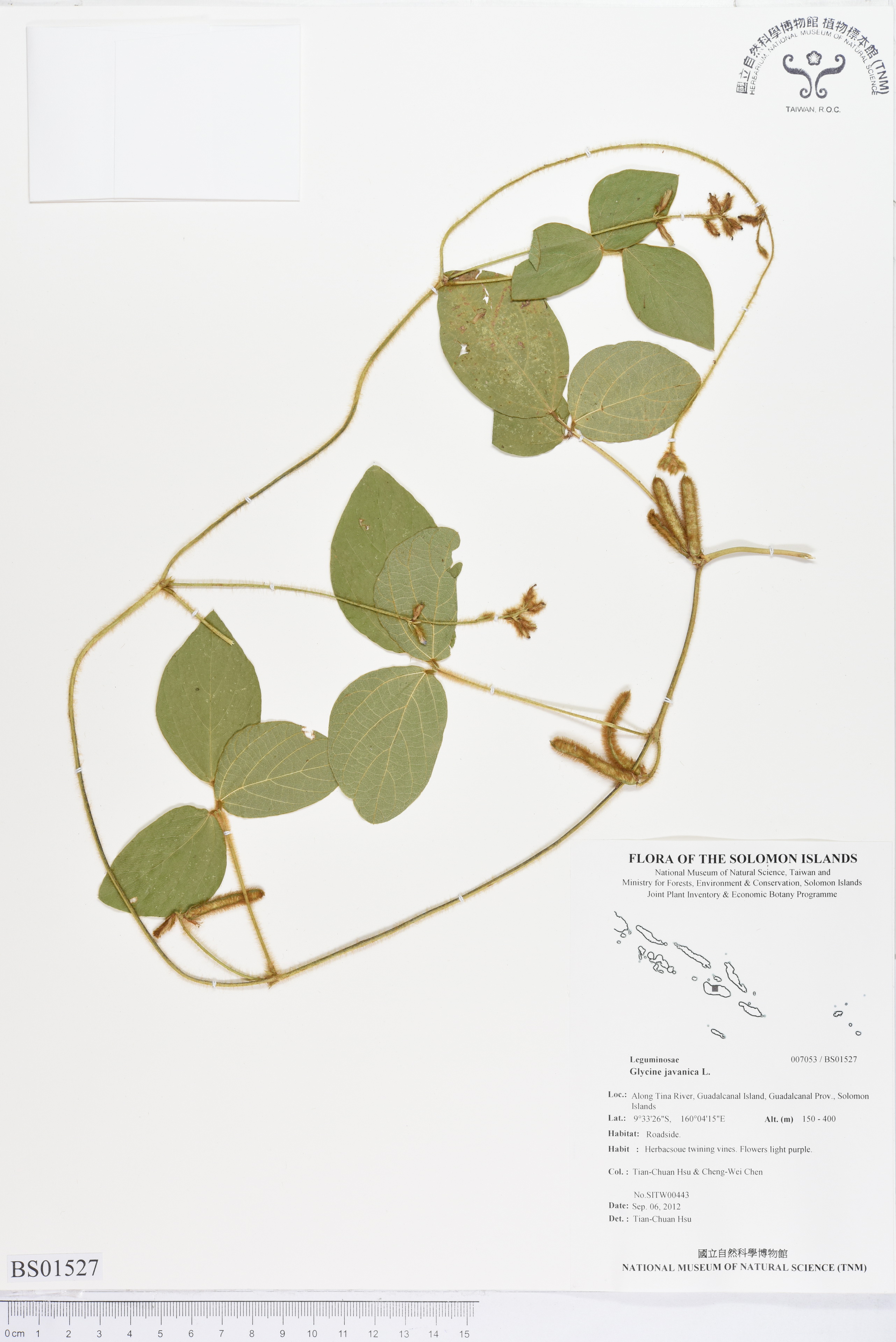 | Field Number: SITW00443 Catalog Number: SITW00443-TNM-001 Family Name: Leguminosae, Dicotyledon Collector(s): Tian-Chuan HSU & Cheng-Wei CHEN Determinated by: T.C. Hsu Collected Date: 6 September 2012 Locality: Along Tina River, Guadalcanal Island, Guadalcanal Province. GPS Coordinates: (9° 33' 26.2" S, 160° 4' 15.1" E) Altitude (m): 150-400 Habit: Herbacsoue twining vines. Flowers light purple. Habitat: Roadside. Herbarium: TNM |