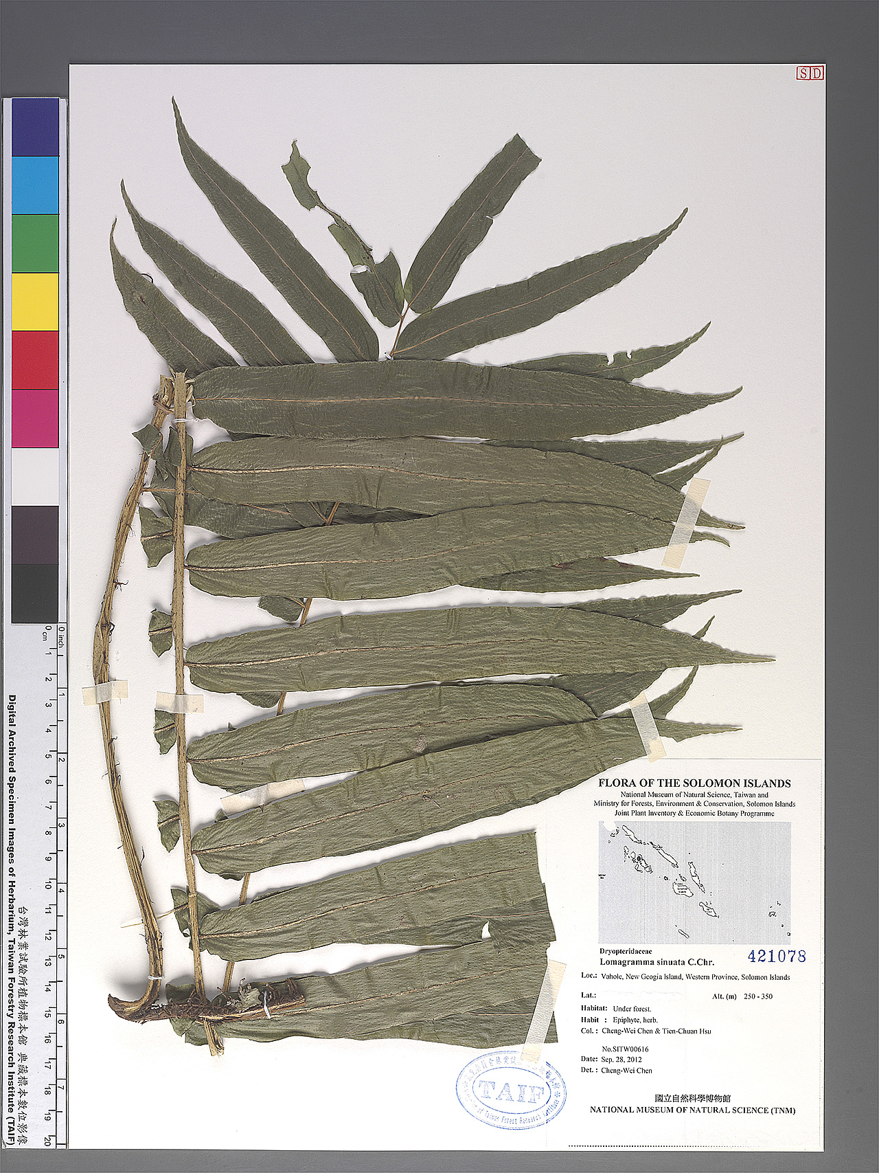| Field Number: SITW00616 Catalog Number: SITW00616-TAIF-001 Family Name: Dryopteridaceae, Pteridophyte Collector(s): Cheng-Wei CHEN & Tian-Chuan HSU Determinated by: C.W. Chen Collected Date: 28 September 2012 Locality: Vahole, New Geogia Island, Western Province GPS Coordinates: (8° 17' 7.1" S, 157° 43' 27.7" E) Altitude (m): 250-350 Habit: Epiphyte, herb Habitat: Under forest Herbarium: TAIF |