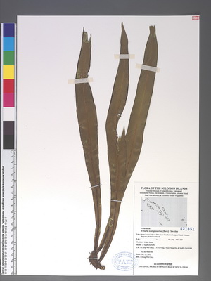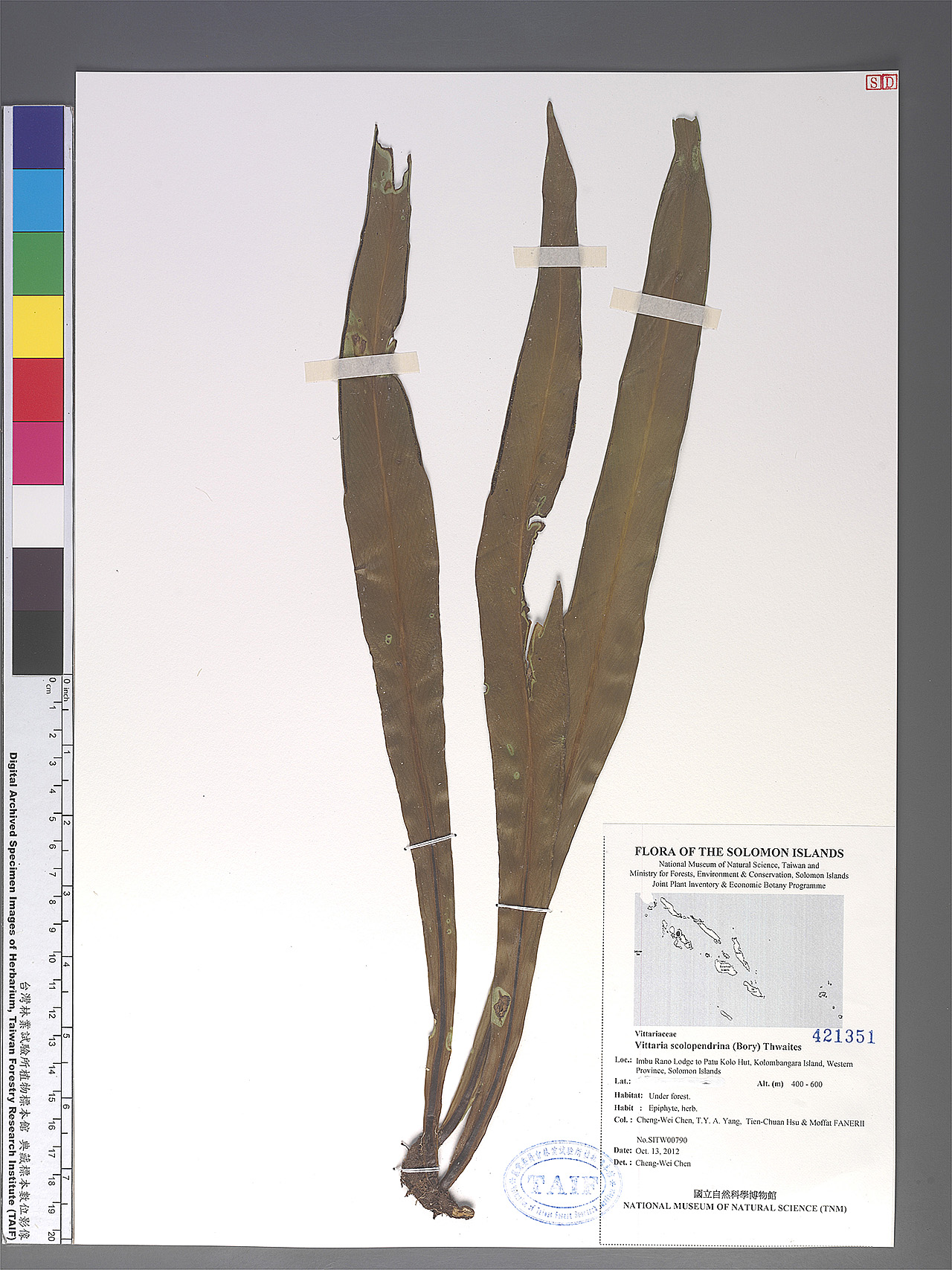 | Field Number: SITW00790 Catalog Number: SITW00790-TAIF-001 Family Name: Pteridaceae, Pteridophyte Collector(s): T.-Y. Aleck YANG, Cheng-Wei CHEN, Tian-Chuan HSU & Moffat FANARII FANERII Determinated by: C.W. Chen Collected Date: 13 October 2012 Locality: Imbu Rano Lodge to Patu Kolo Hut, Kolombangara Island, Western Province GPS Coordinates: (8° 1' 4.3" S, 157° 6' 45.9" E) Altitude (m): 400-600 Habit: Epiphyte, herb Habitat: Under forest Herbarium: TAIF |