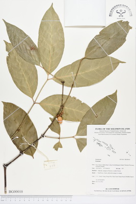 | Field Number: SITW00878 Catalog Number: SITW00878-TNM-001 Family Name: Gnetaceae, Gymnosperm Collector(s): T.-Y. Aleck YANG, Cheng-Wei CHEN, Tian-Chuan HSU & Moffat FANARII FANERII Determinated by: T.Y.A. Yang & C.F. Chen Collected Date: 16 October 2012 Locality: Pig Camp to Imbu Rano Lodg, Kolombangara Island, Western Province GPS Coordinates: (8° 1' 4.4" S, 157° 6' 46.3" E) Altitude (m): 595 Habit: Small trees; fruits yellowish-orange to orange Habitat: Pathside, margin of forests or under forests Herbarium: TNM |