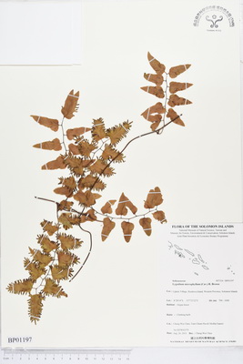| Field Number: SITW03379 Catalog Number: SITW03379-TNM-001 Family Name: Schizaeaceae, Pteridophyte Collector(s): Cheng-Wei CHEN, Tian-Chuan HSU & Moffat FANARII Determinated by: C.W. Chen Collected Date: 26 August 2013 Locality: Ugele Village, Rendova Island, Western Province GPS Coordinates: (8° 28' 14.4" S, 157° 21' 21.9" E) Altitude (m): 700-1000 Habit: Climbing herb Habitat: Origin forest Herbarium: TNM |