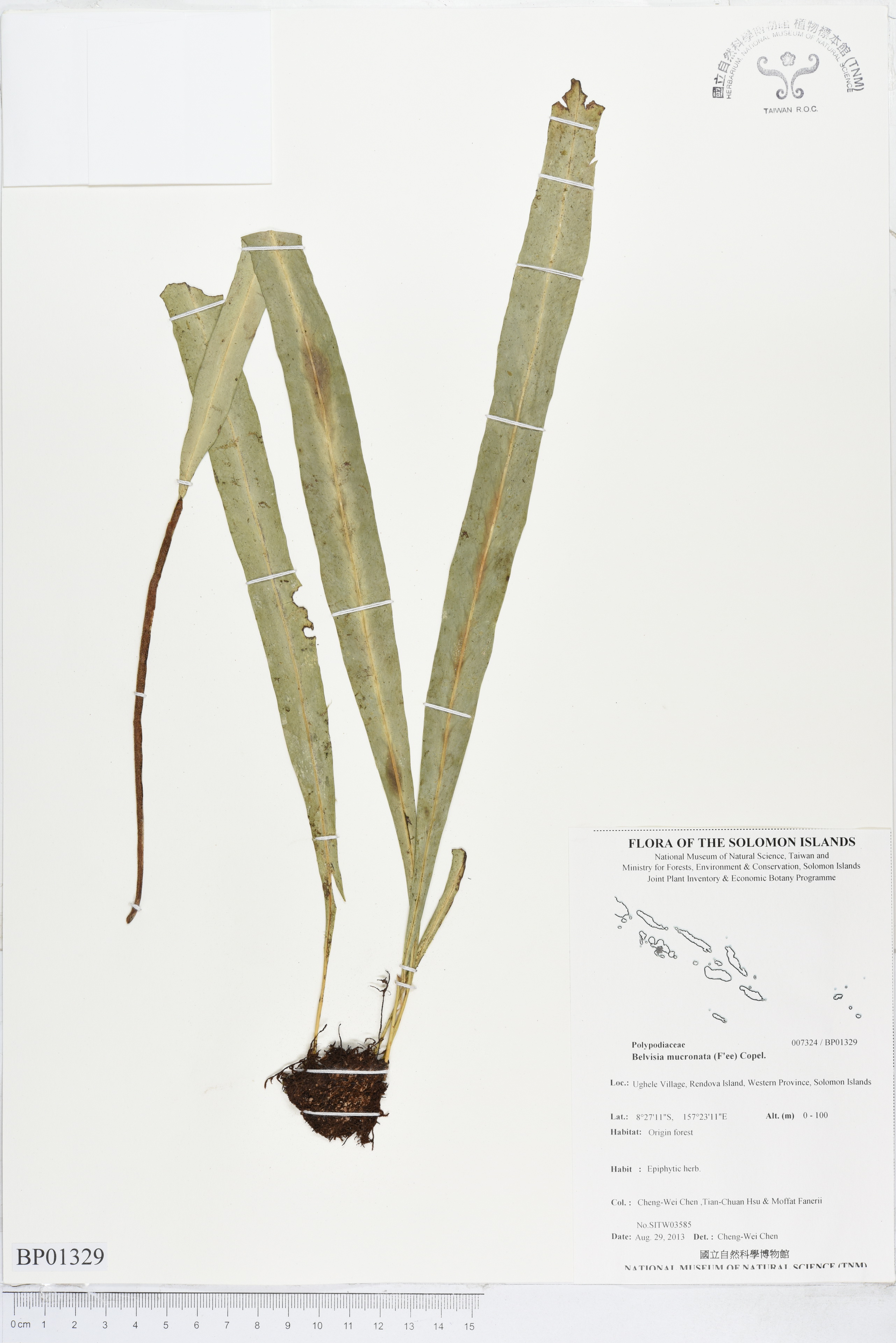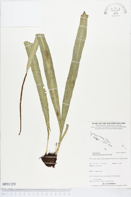 | Field Number: SITW03585 Catalog Number: SITW03585-TNM-001 Family Name: Polypodiaceae, Pteridophyte Collector(s): Cheng-Wei CHEN, Tian-Chuan HSU & Moffat FANARII Determinated by: C.W. Chen Collected Date: 29 August 2013 Locality: Ugele Village, Rendova Island, Western Province GPS Coordinates: (8° 27' 11.3" S, 157° 23' 10.7" E) Altitude (m): 0-100 Habit: Epiphytic herb Habitat: Origin forest Herbarium: TNM |